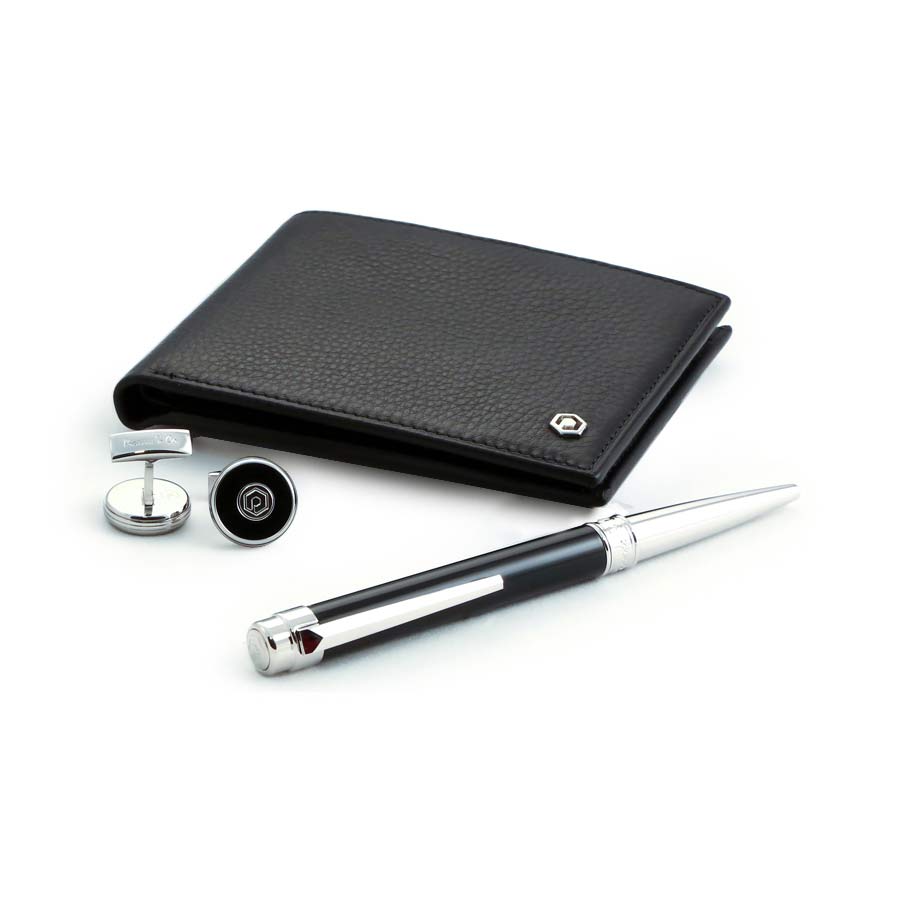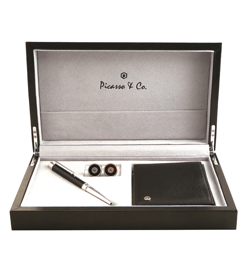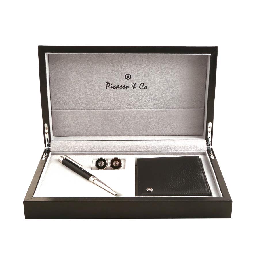 بيكاسو اند كو طقم قلم وكبك نقش متماثل لون فضي واسود مع محفظة جلد كبك: مصنوع من معدن الستيل مقاوم للصدأ مطلي بلون فضي مع الياف كربونية سوداء قلم رجالي حبر جاف لون اسود محفظة كلاسيك جلد طبيعي , لونين اسود مع علبة فخمة
