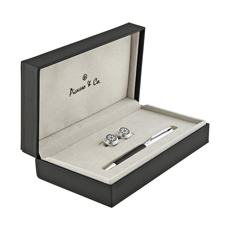 بيكاسو اند كو طقم قلم وكبك نقش متماثل -زهرة الملك السويدية- لون فضي واسود كبك: مصنوع من معدن الستيل مقاوم للصدأ مطلي بلون فضي مع الياف كربونية سوداء قلم: حبر جاف مطلي باللون الفضي والاسود طوله مغلق 13.5 سم مع علبة فخمة
