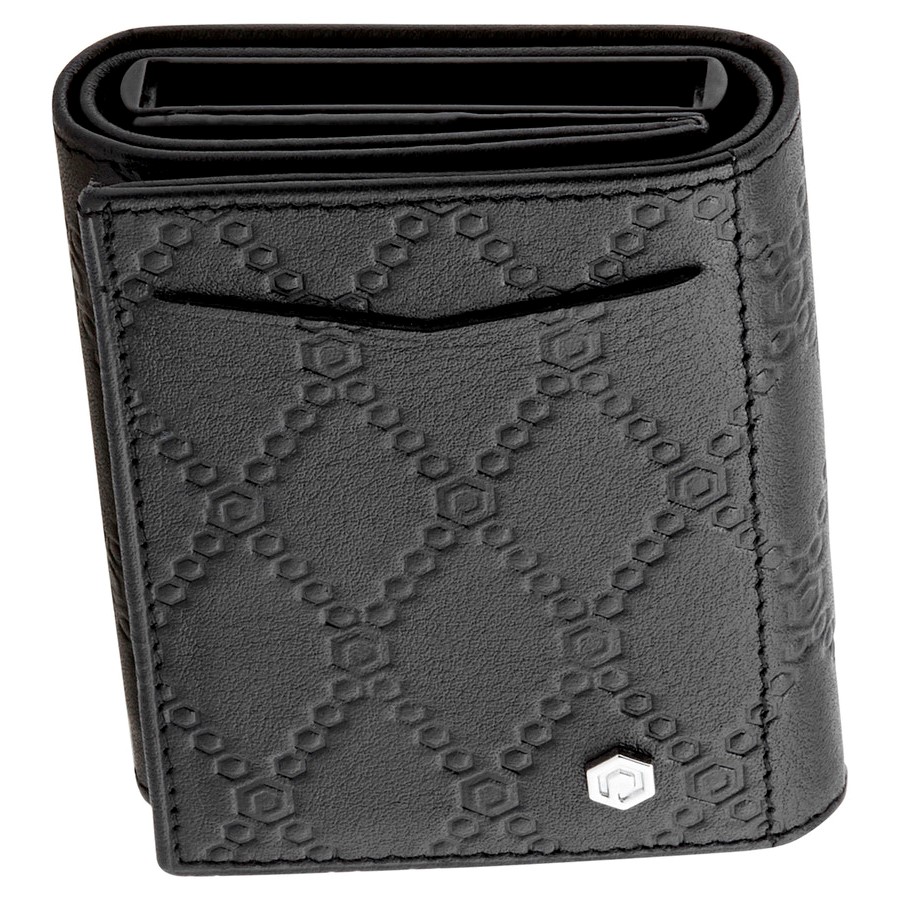 حامل بطاقات من جلد العجل باللون الاسود وصندوق من الفولاذ المقاوم للصدأ Picasso and Co. لذلك يتميز حامل البطاقة هذا: 1 حجرة نقدية ، 4 فتحات لبطاقات الائتمان ، 6 داخل الصندوق المصنوع من الفولاذ المقاوم للصدأ بالإضافة إلى نظام منزلق.