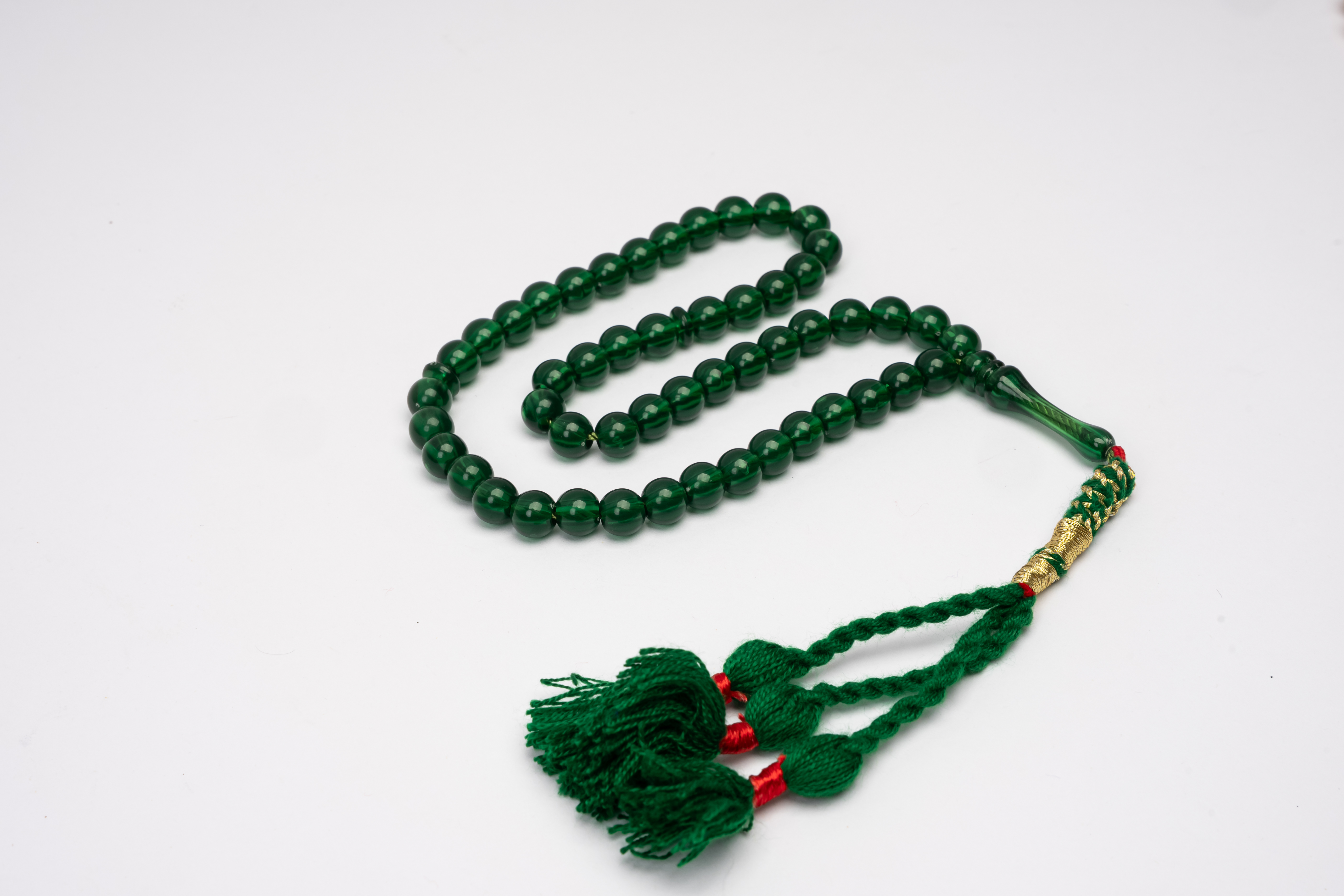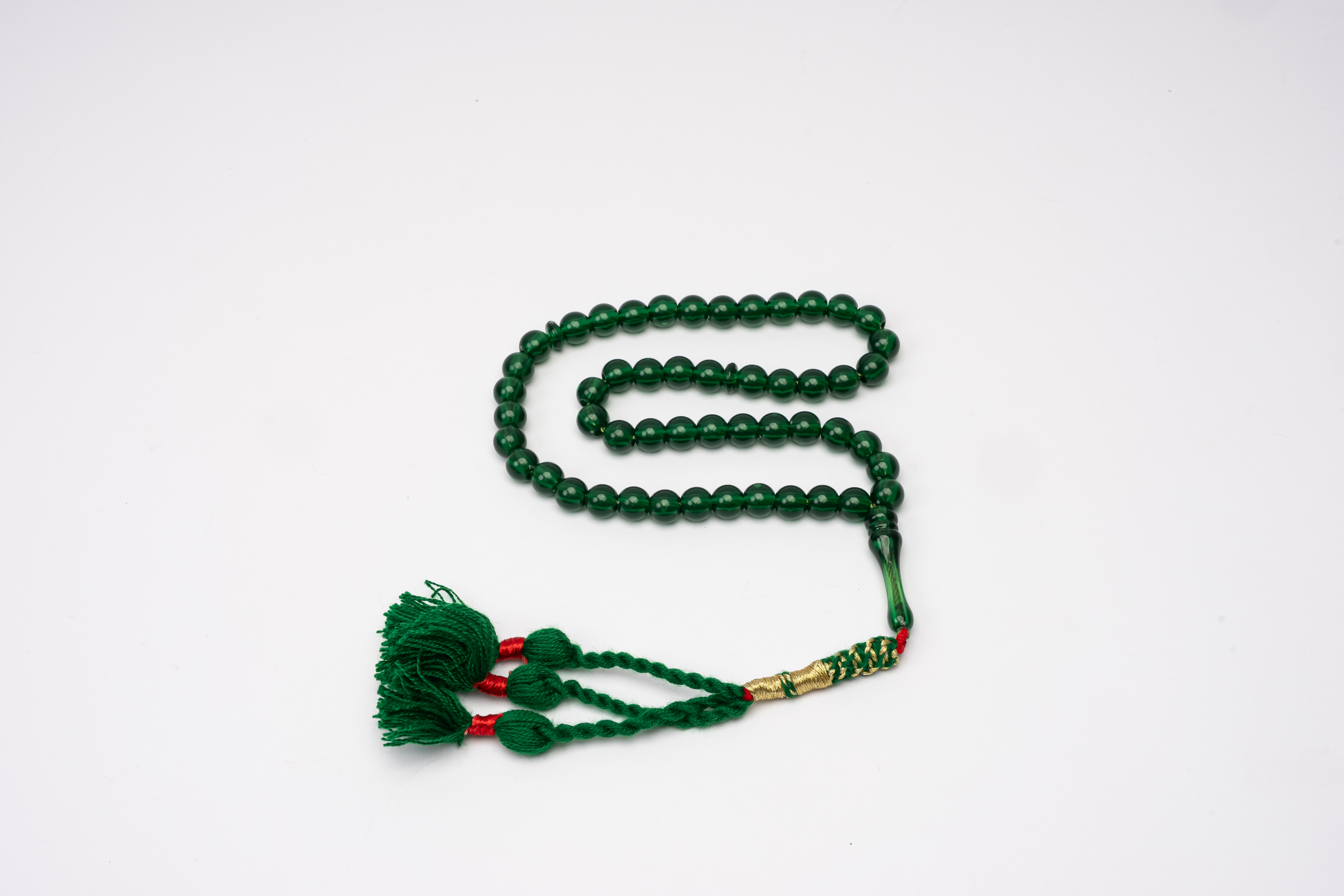 تتميّز هذه السبحة بحباتها الناصعة باللون الآخضر، الذي يرمز للنور والطاقة الإيجابية، وتكتمل بتفصيل كراكيش قماشية خضراء ثلاثية مصنوعة بإتقان لتمنحها لمسة عربية تقليدية